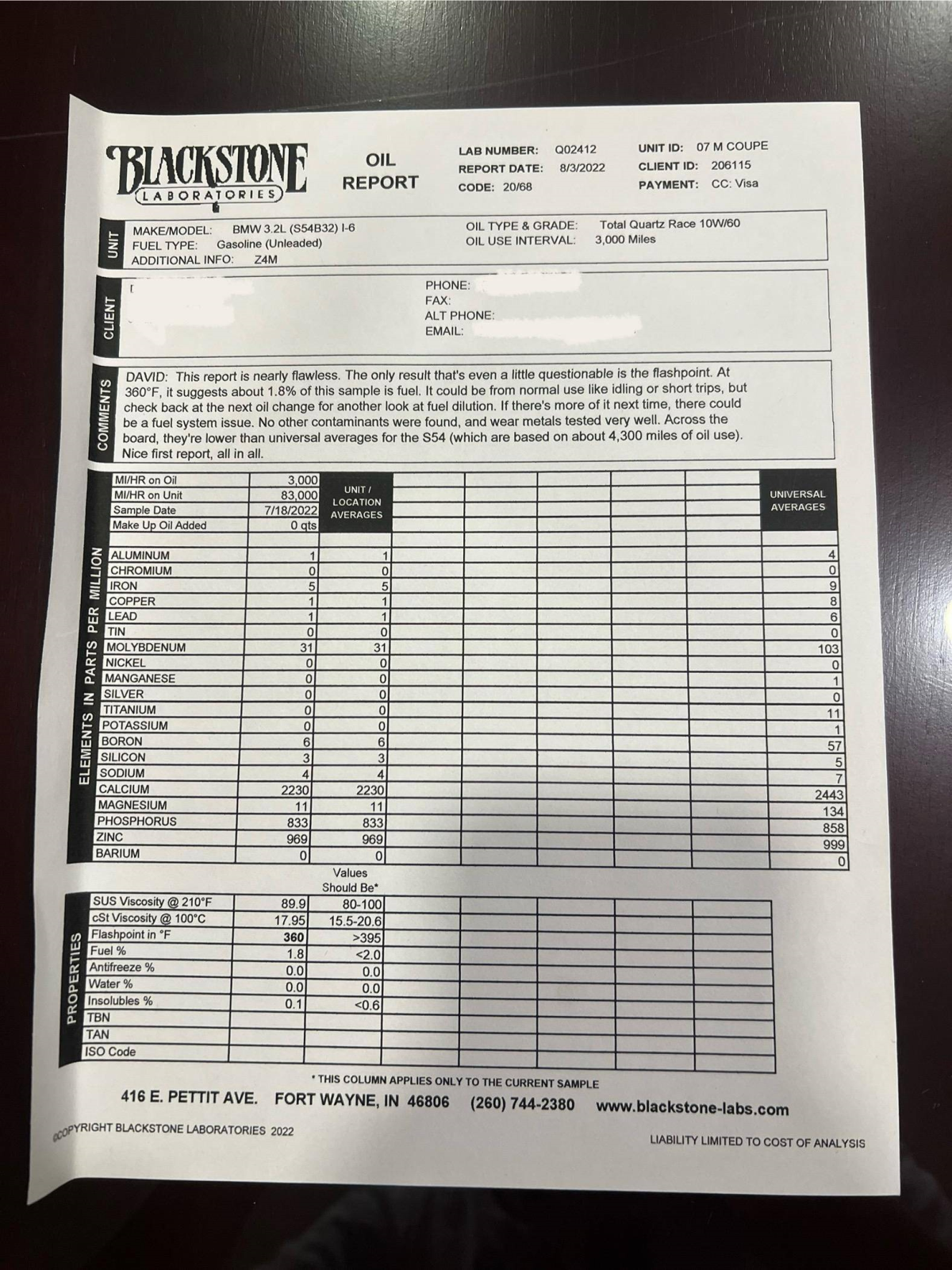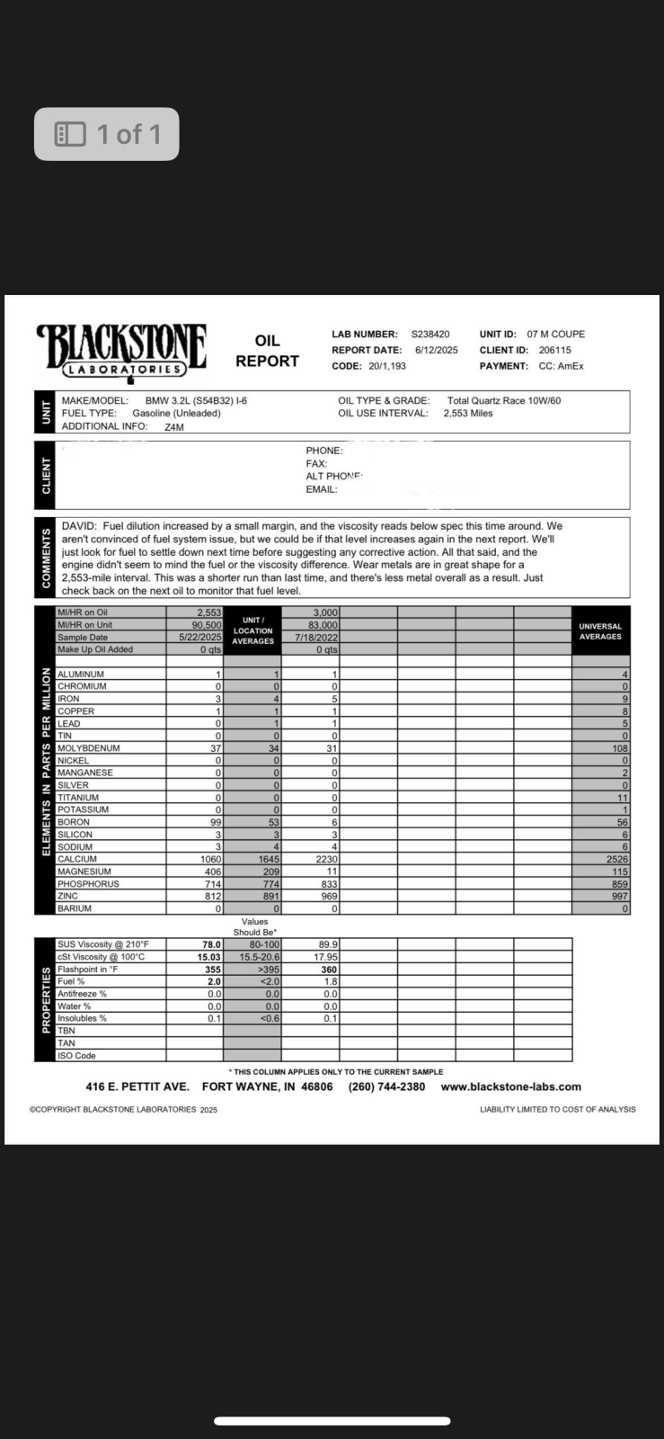 A Blackstone Laboratories oil analysis report from June 2025 is provided in the gallery.