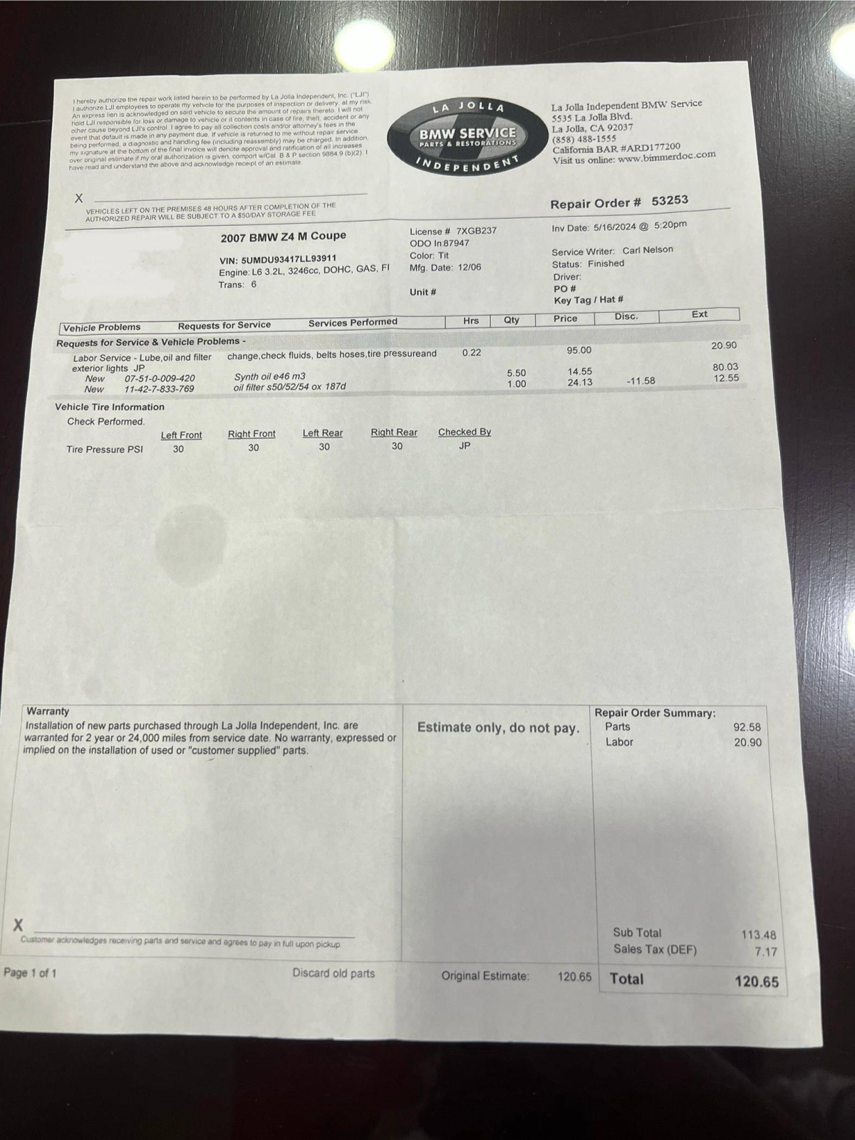 - May 2024 (87,947 miles): Engine oil and filter changed