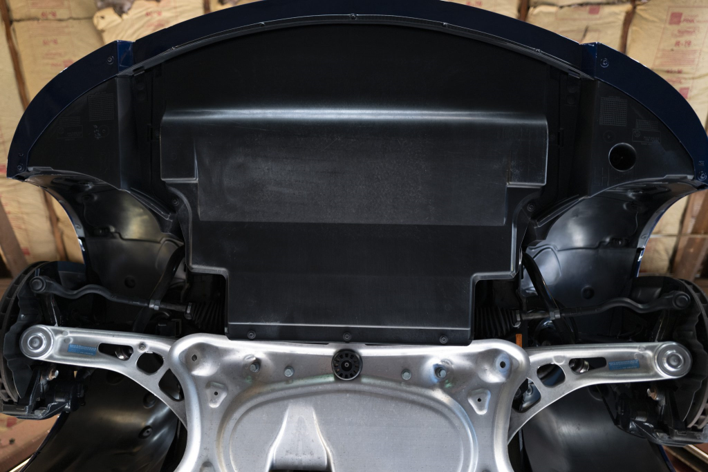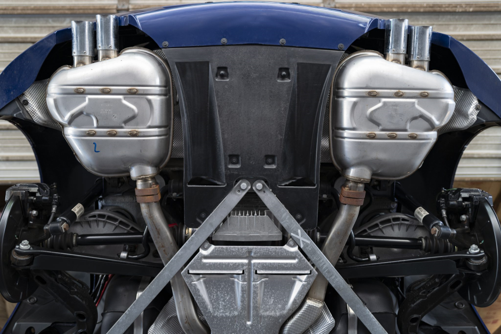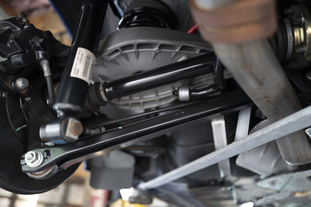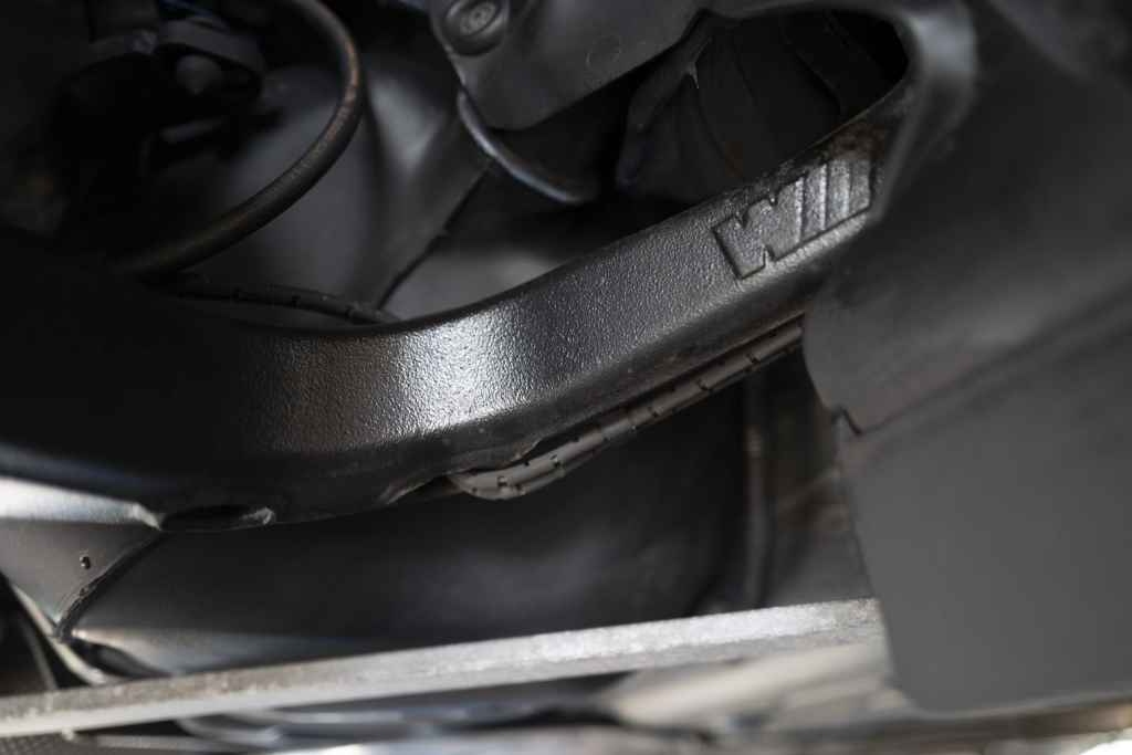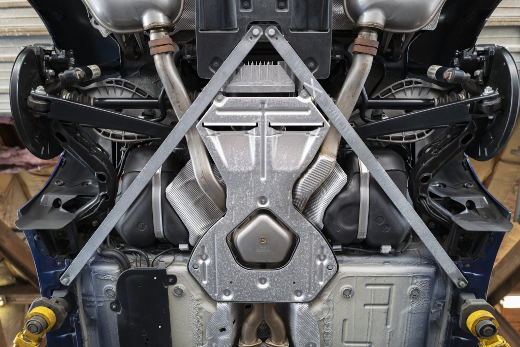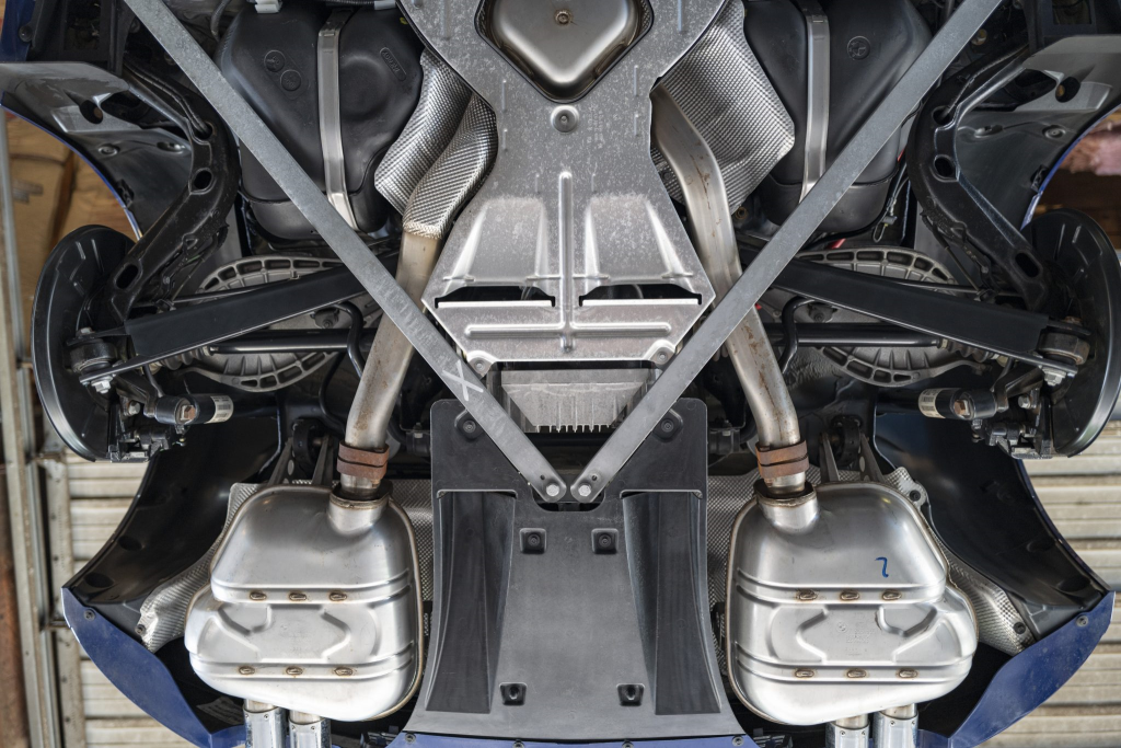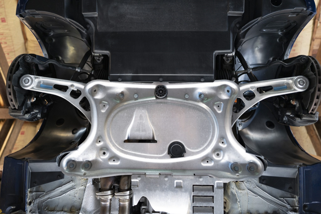 Power is sent to the rear wheels through a six-speed manual transmission and a limited-slip differential. Additional photos of the underside are provided in the gallery.