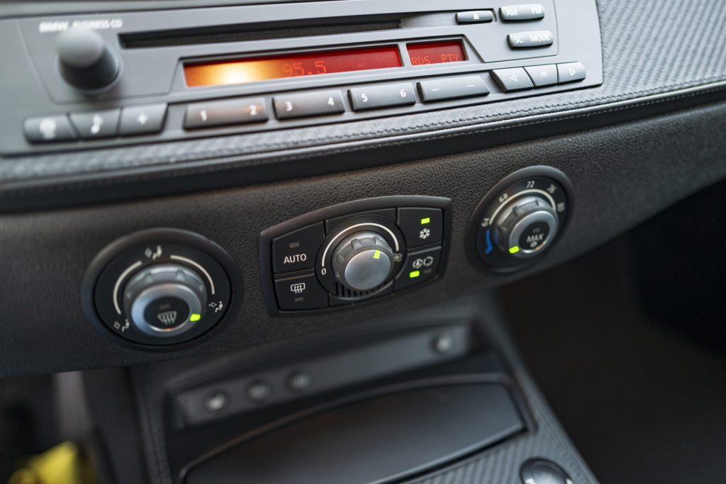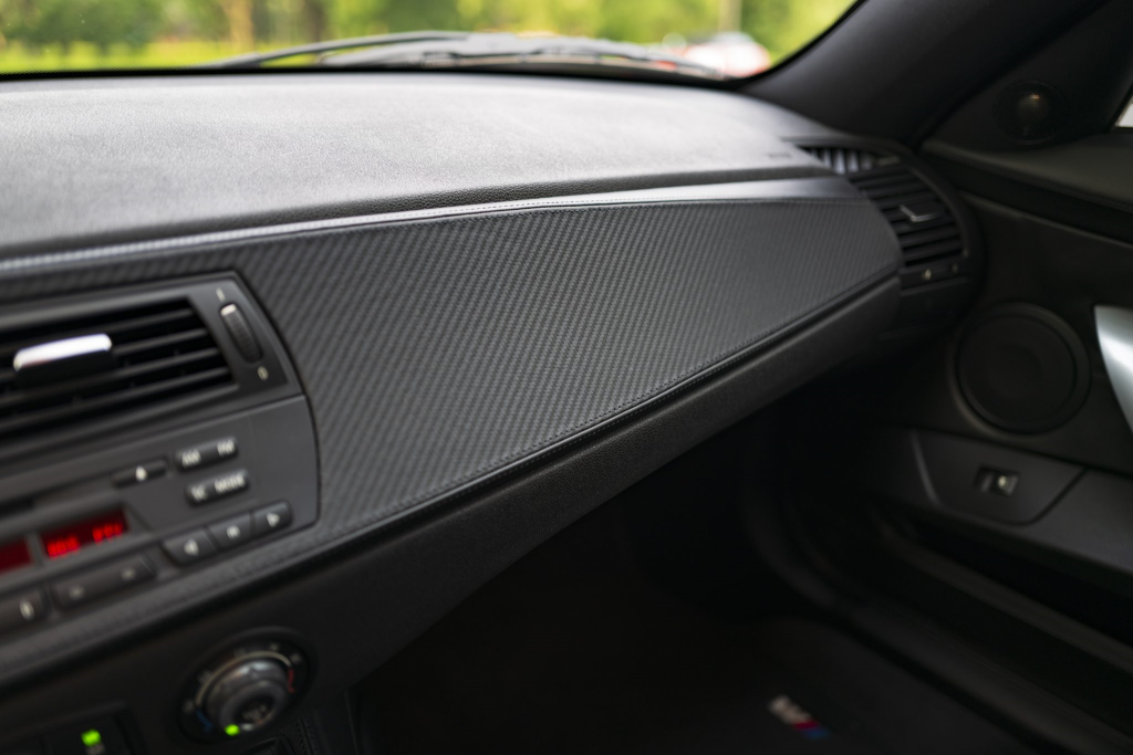 The cabin features black Nappa leather upholstery covering the heated power-adjustable sport seats, while Carbon Structure leather adorns the dashboard and center console. Interior appointments include a BMW Business CD stereo, a backlit shift knob, M-branded floor mats, M door sill plates, and automatic climate control.