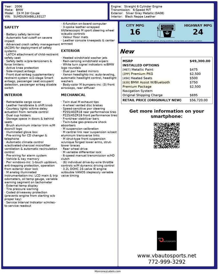 This vehicle is for sale by VB AUTOSPORTS. Year : 2006 Make : BMW Model : Z4 M Mileage : 15674 MI Body style : Other Exterior color : Gray Interior color : Black premium leather