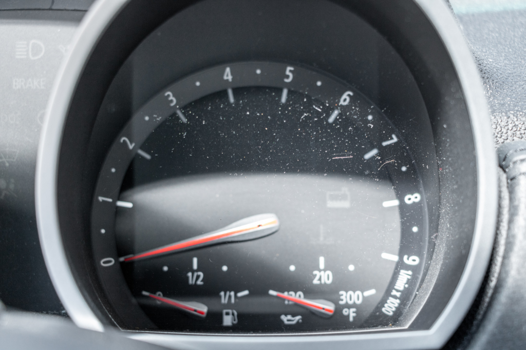 Instrumentation consists of a 185-mph speedometer, a 9k-rpm tachometer, and gauges for fuel level and oil temperature. The digital odometer shows 54k miles, approximately 7k of which were added by the seller since late 2014.
