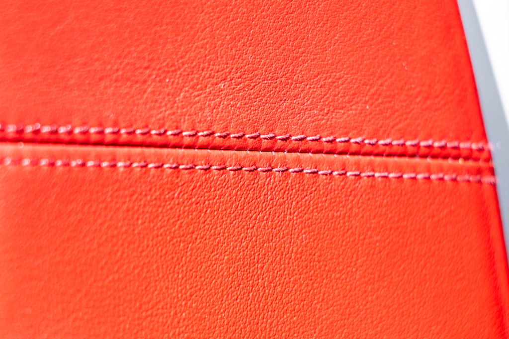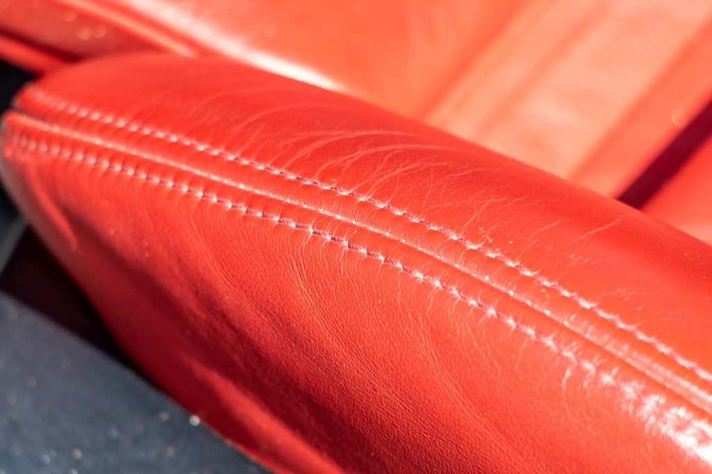 The interior is upholstered in black with Imola Red leather M Sport seats and door panel inserts. Features include a BMW Business CD stereo, automatic climate control, and a leather-wrapped M Sport steering wheel. The seller notes that the tire pressure sensor light is illuminated.
