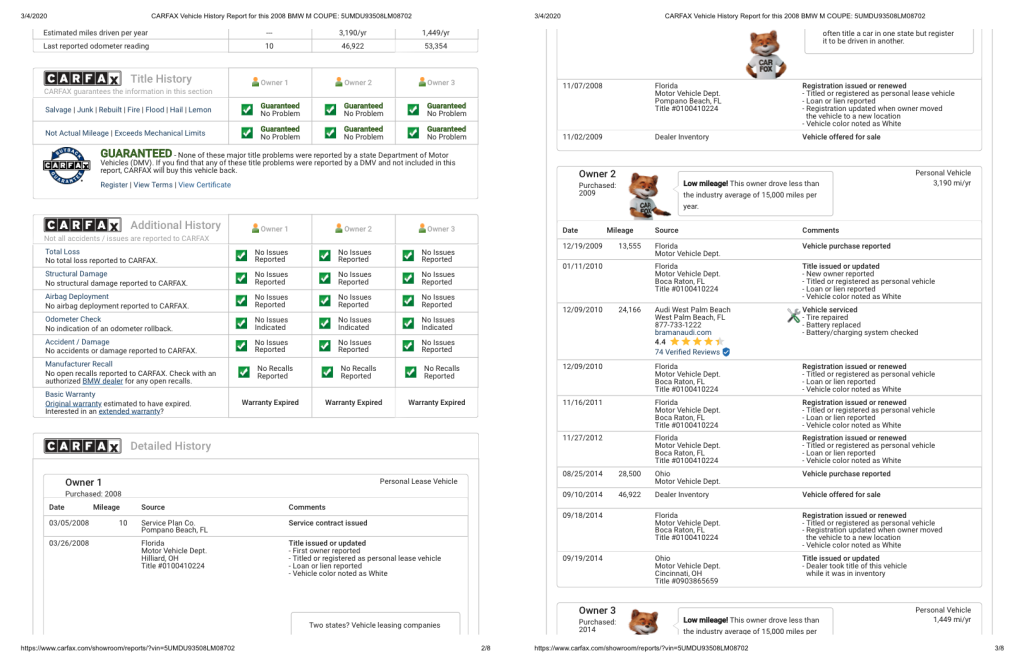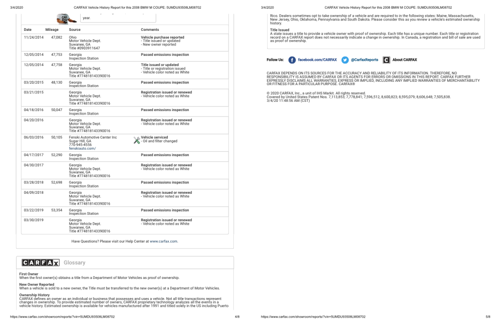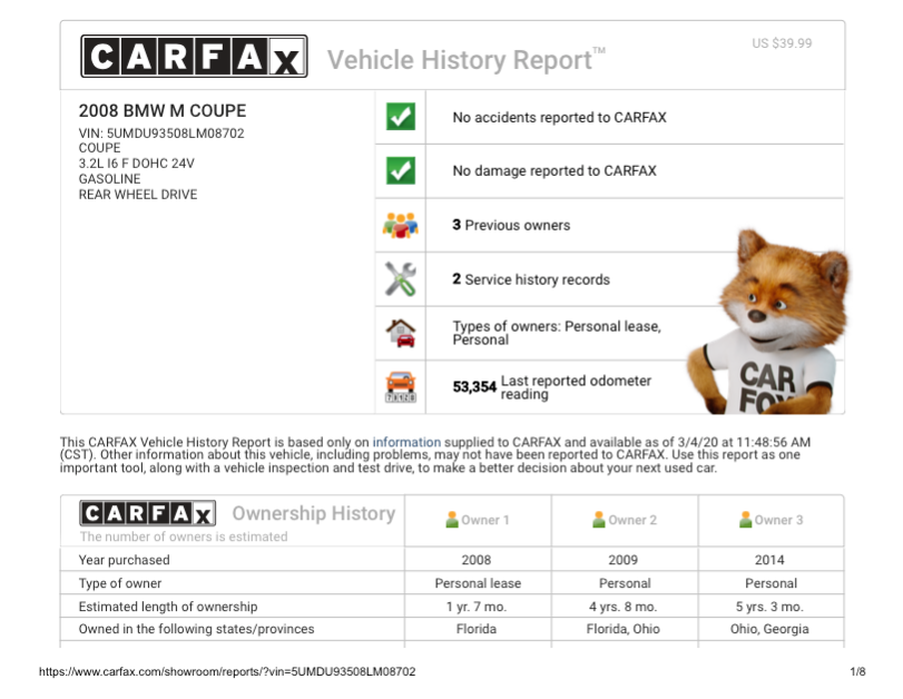 The March 2020 Carfax report indicates no accidents or damage and shows registration history in Florida, Ohio, and Georgia through its most recent entry in March 2019.