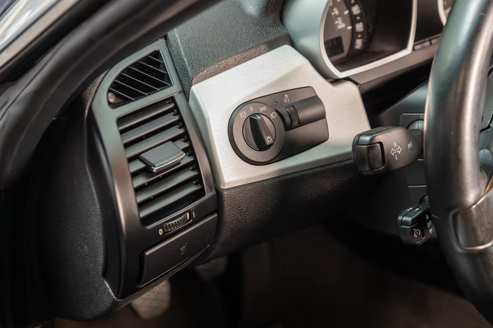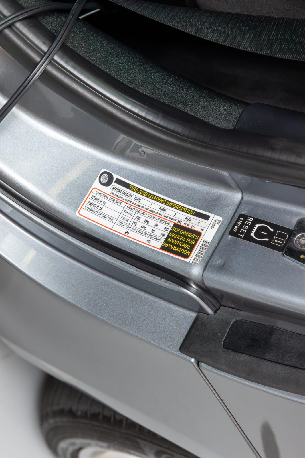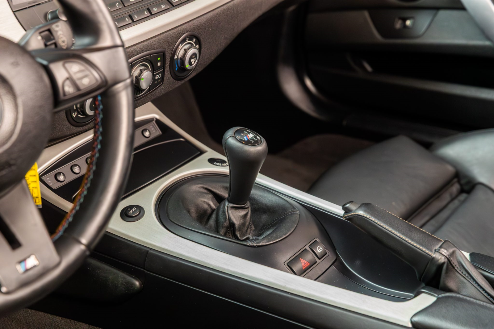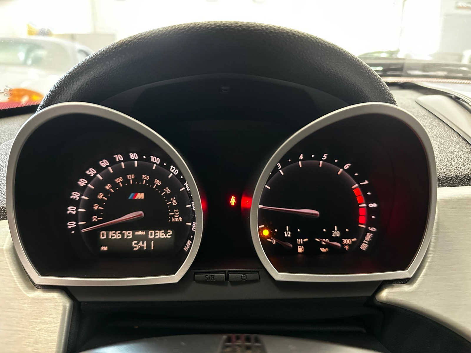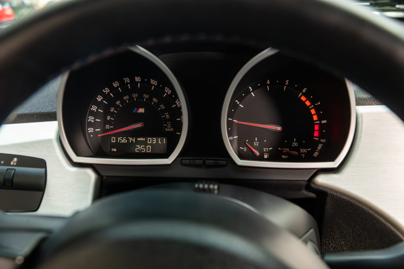 The leather-wrapped multifunction steering wheel features tri-color stitching and frames a 190-mph speedometer and a tachometer with an 8k-rpm redline as well as gauges for oil temperature and fuel level. The digital odometer indicates 16k miles, approximately 400 miles of which were added during current ownership.